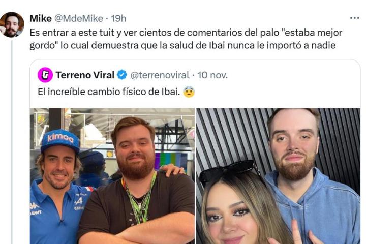 A este mensaje le contestó el usuario @MdeMike, que no dudó en criticar a las respuestas que estaban dando y hacer la siguiente reflexión: "Es entrar a este tuit y ver cientos de comentarios del palo 'estaba mejor gordo' lo cual demuestra que la salud de Ibai nunca le importó a nadie".