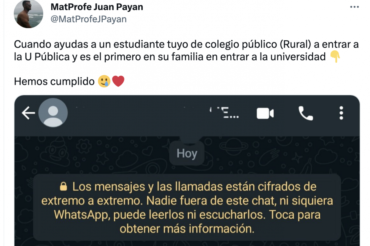 "Cuando ayudas a un estudiante tuyo de colegio público (Rural) a entrar a la U Pública y es el primero en su familia en entrar a la universidad. Hemos cumplido", ha escrito en Twitter @MatProfeJPayan.