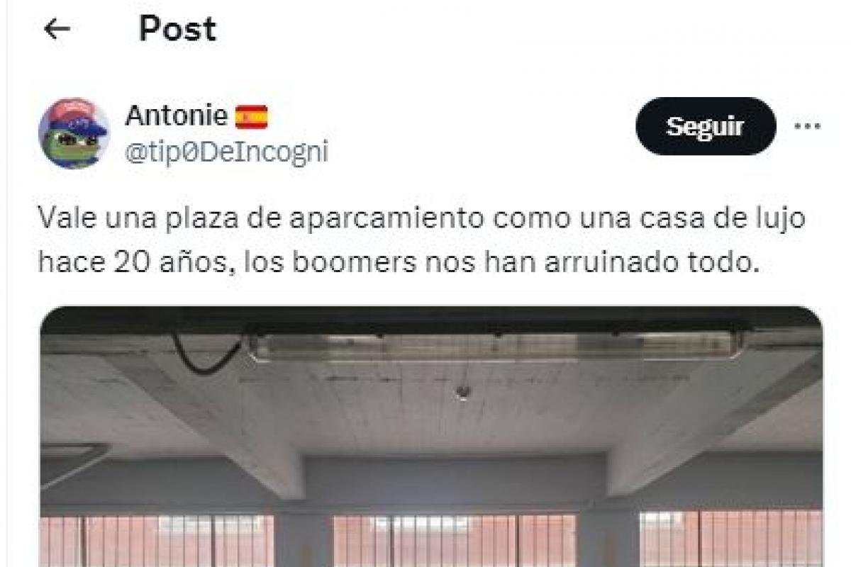 "Vale una plaza de aparcamiento como una casa de lujo de hace 20 años. Los boomers nos han arruinado todo", ha comentado el tuitero indignado por el elevado precio de este parking de 33 metros cuadrados que sirve "para coche y moto".
