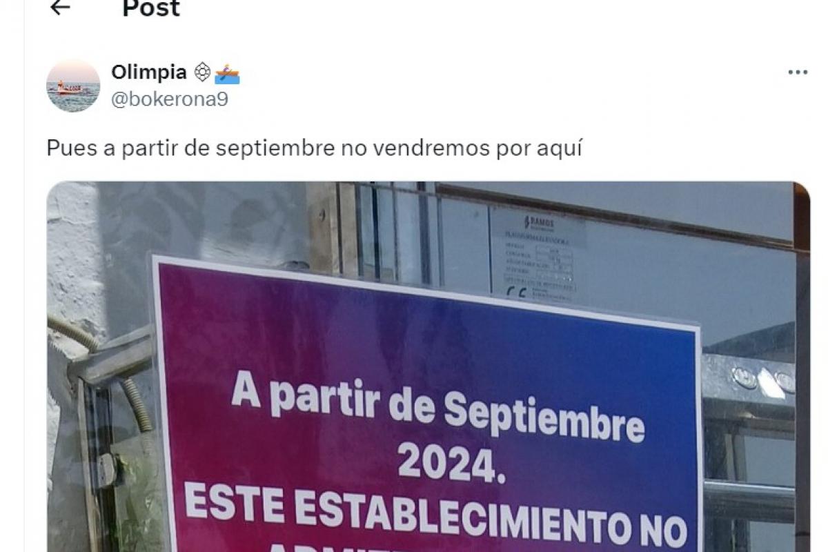 Lo ha subido la usuaria de X @bokerona9 junto al mensaje: "Pues a partir de septiembre no vendremos por aquí". Y en el letrero se lee: "A partir de septiembre de 2024, este establecimiento no admite pagos con datáfono ni con Bizum. Disculpen las molestias".