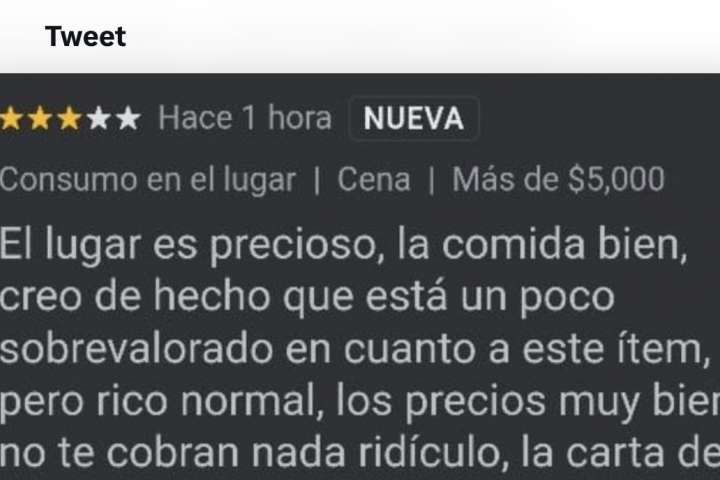 El comentario del comensal, que tiene tres estrellas sobre cinco, empieza valorando el lugar y dice que es "precioso": "La comida bien. Creo de hecho que está un poco sobrevalorado en este ítem. Rico normal. Los precios bien, no te cobran nada ridículo".