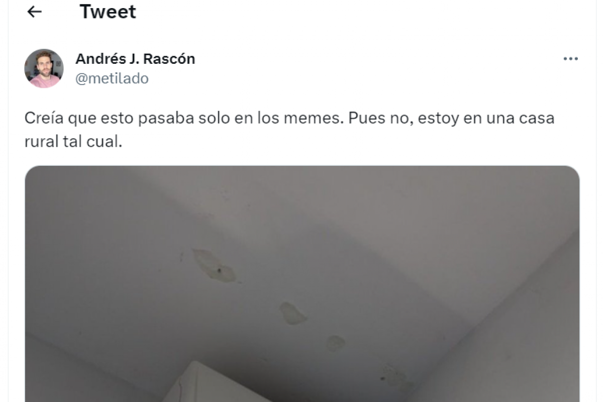 "Creía que esto pasaba solo en los memes. Pues no, estoy en una casa rural tal cual", ha escrito junto a la instantánea, en la que se ve un aparato de aire acondicionado que traspasa un tabique a la mitad para servir a dos habitaciones.