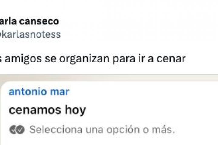 Ha sido la usauria Karla Canseco (@karlasnotess) la que ha logrado una histórica repercusión de un tuit al publicar una captura de pantalla de cómo Antonio, un amigo suyo, ha querido plantear en el grupo de amigos de WhatsApp la posibilidad de ir a cenar. "Point of view: tus amigos se organizan para ir a cenar", ha escrito junto a la imagen.