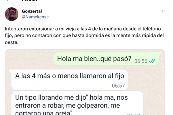 "Intentaron extorsionar a mi vieja a las 4 de la mañana desde el teléfono fijo, pero no contaron con que hasta dormida es la mente más rápida del oeste", dice el usuario, que adjunta el pantalla de WhatsApp donde la mujer explica detalladamente qué le sucedió.