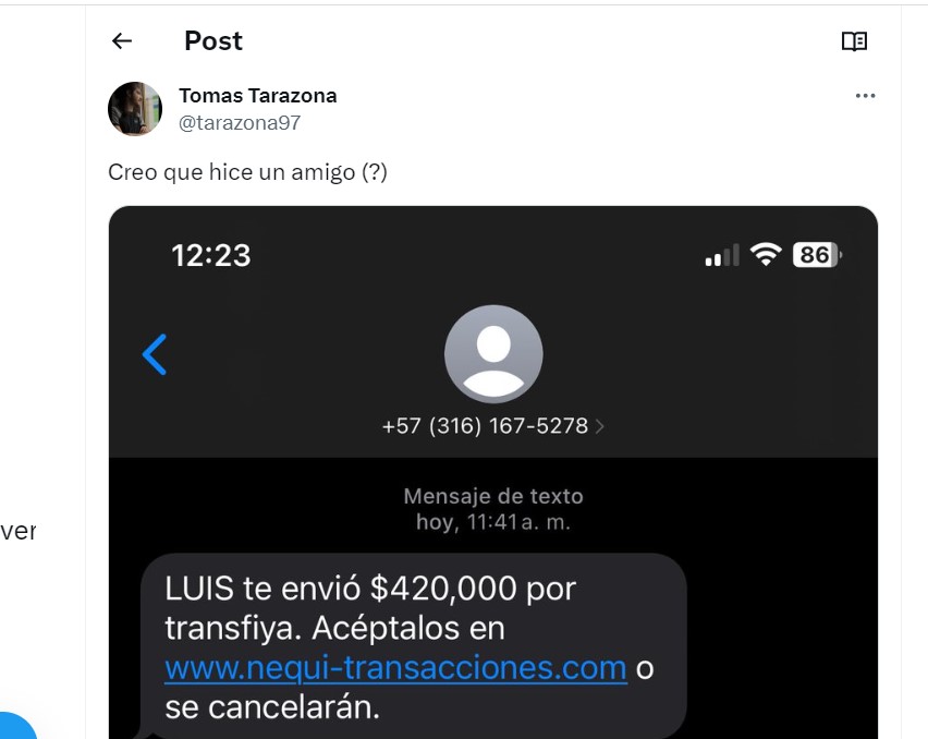 El usuario ha subido a X, la red social antes llamada Twitter, una captura de pantalla de los mensajes que intercambió con un delincuente que trató de robarle. La técnica que usó es un clásico: envía a la víctima un SMS asegurando que una persona le ha enviado una gran cantidad de dinero y que, para aceptarlo, solo tiene que pinchar en un enlace.