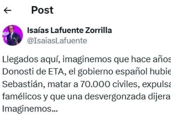 "Llegados aquí, imaginemos que hace años, para acabar con el Comando Donosti de ETA, el gobierno español hubiera decidido bombardear San Sebastián, matar a 70.000 civiles, expulsar a los supervivientes famélicos y que una desvergonzada dijera que la culpa es de ETA. Imaginemos...", contó el periodista en un primer tuit.