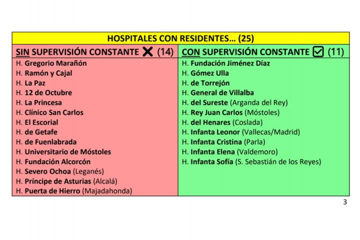 Al ponernos en contacto con algunos de los hospitales involucrados para brindarles la oportunidad de ofrecer su versión de los hechos, como el Hospital Universitario Príncipe de Asturias, el Hospital Universitario de Móstoles o el Hospital universitario La Paz, la propuesta ha sido rechazada. No quieren valorar el documento argumentando que la investigación "no es oficial y se ha realizado por una persona durante su periodo de formación, no por profesionales".