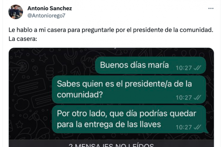 "Le hablo a mi casera para preguntarle por el presidente de la comunidad. La casera", ha escrito el tuitero, cuyo mensaje acumula en menos un día más de 19.000 'me gusta'.