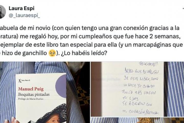 "La abuela de mi novio—con quien tengo una gran conexión gracias a la literatura— me regaló hoy, por mi cumpleaños que fue hace dos semanas, un ejemplar de este libro tan especial para ella—y un marcapáginas que me hizo de ganchillo—. ¿Lo habéis leído?", expresó en el tuit, que ha acumulado casi un millón de visualizaciones y más de 43.000 'me gusta' en menos de 12 horas.