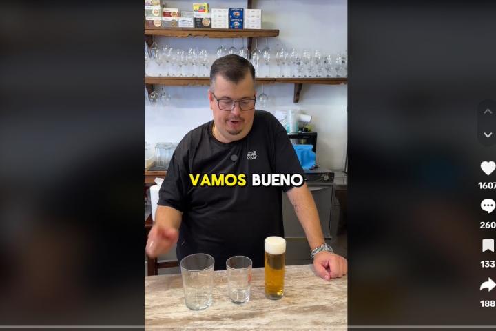 "Nosotros tenemos la cerveza en tubo. 1,20 euros. Y os voy a enseñar una cosita a ver qué pensáis", explica. A continuación, vacía el contenido del vaso de tubo en otro del tamaño estándar. Y lo que se ve es que no cabe todo en el segundo.