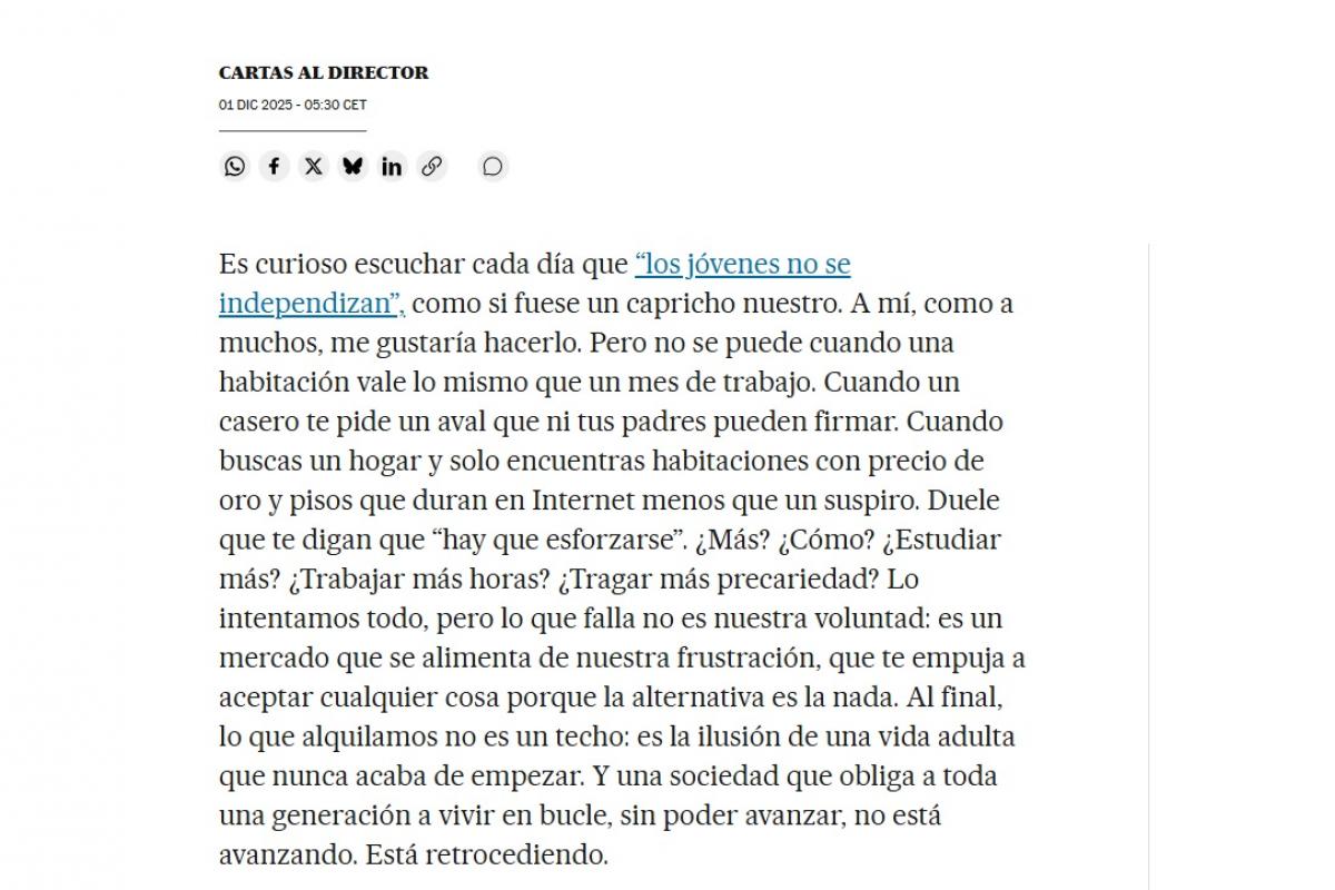 Esta lectora de El País asegura que le gustaría independizarse, pero no puede cuando "una habitación vale lo mismo que un mes de trabajo" o cuando "un casero te pide un aval que ni tus padres pueden firmar". No es la primera vez que en las cartas al director del periódico se denuncia este problema, anquilosado en la vida de los españoles, pero sí una de las veces que se hace con mayor contundencia.