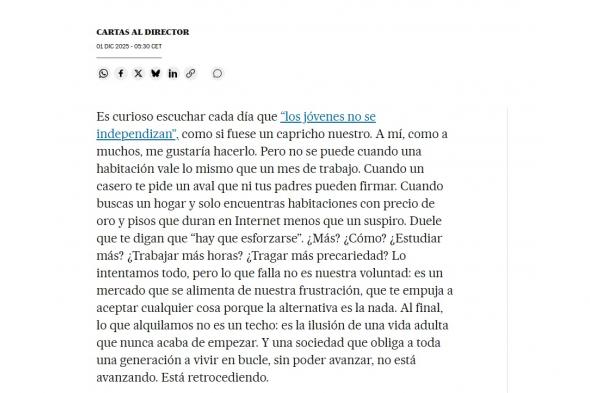 La carta al director de 'El País' que es un golpe de realidad a los que dicen que los jóvenes no se independizan porque no quieren