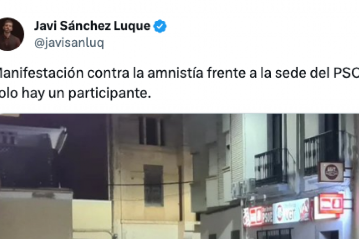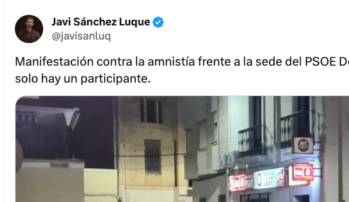 "Manifestación contra la amnistía frente a la sede del PSOE Don Benito, solo hay un participante", escribió el periodista Javi Sánchez (@javisanluq) en la red social, junto a una foto en la que se podía ver a esa persona delante de la sede del PSOE y sosteniendo una bandera de España.