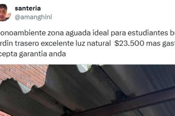 "Monoambiente zona Aguada. Ideal para estudiantes, buena ubicación, jardín trasero, excelente luz natural. $23.500 más gastos comunes. Se acepta garantía anda", ha manifestado el tuitero, en tono irónico, justo antes de adjuntar la imagen.