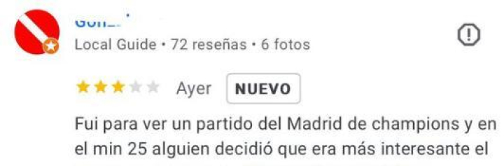 "Fui para ver un partido del Madrid de Champions y en el minuto 25 alguien decidió que era más interesante el partido del Granada", escribió el cliente en las reseñas de Google, puntuando, además, con tres estrellas al local.