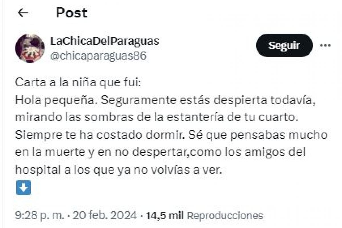 La usuaria @chicaparaguas86 ha escrito en su cuenta de X "una carta a la niña" que fue, como una forma de contar por todo lo que ha pasado. "Hola pequeña. Seguramente estás despierta todavía, mirando las sombras de la estantería de tu cuarto. Siempre te ha costado dormir", ha comenzado.