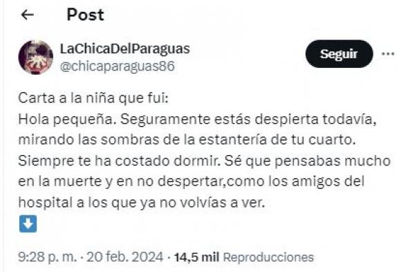 La usuaria @chicaparaguas86 ha escrito en su cuenta de X "una carta a la niña" que fue, como una forma de contar por todo lo que ha pasado. "Hola pequeña. Seguramente estás despierta todavía, mirando las sombras de la estantería de tu cuarto. Siempre te ha costado dormir", ha comenzado.