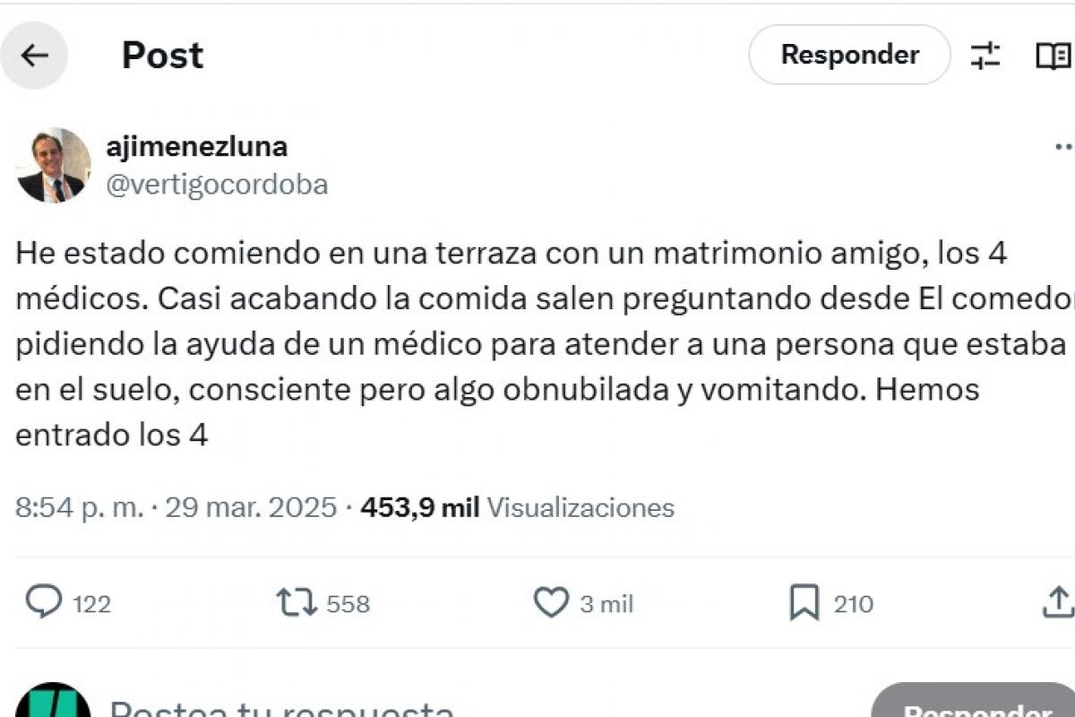 El sanitario ha relatado en la red social X que todo ocurrió cuando estaba comiendo en el local con otros médicos. "Casi acabando la comida salen preguntando desde el comedor pidiendo la ayuda de un médico para atender a una persona que estaba en el suelo, consciente pero algo obnubilada y vomitando. Hemos entrado los cuatro", ha contado.