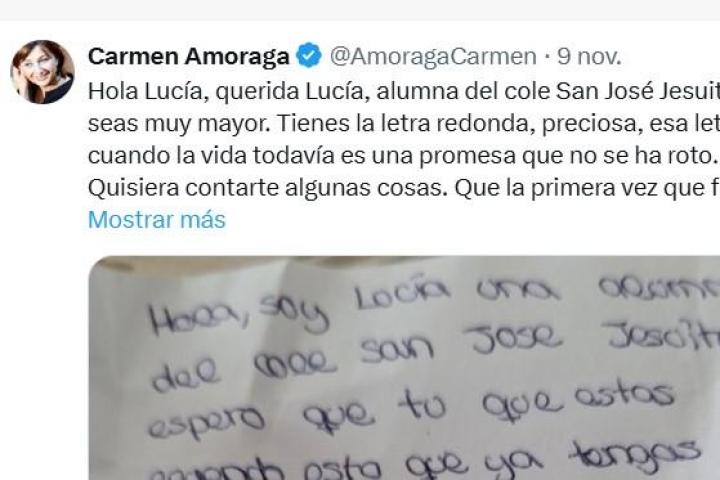 Amoraga ha publicado la nota en la red social X y ha respondido a esa carta. "Hola Lucía, querida Lucía, alumna del cole San José Jesuitas. No creo que seas muy mayor. Tienes la letra redonda, preciosa, esa letra que se tiene cuando la vida todavía es una promesa que no se ha roto", empieza diciendo.