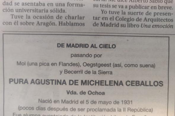 Tras esto, continúa: "Pura Agustina de Michelena Ceballos, vda. de Ochoa, nació en Madrid el 5 de mayo de 1931 (pocos días después de ser proclamada la II República). Fue alumna aventajada de la Institución Libre de Enseñanza (hasta la catástrofe) y pasó con toda seguridad a mejor vida el 18 de junio de 2025, habiendo recibido a sus siete hijos: Cristina, Francisco, Carmen, Jose, Mariaje, Juan y María Pura".