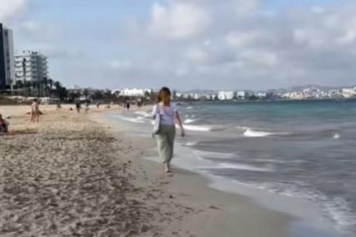 La usuaria de Tiktok @buscandonubes_ ha subido un vídeo a su cuenta de la red social enseñando la frase de una camiseta de una mujer que está paseando tranquilamente por una playa de Baleares.