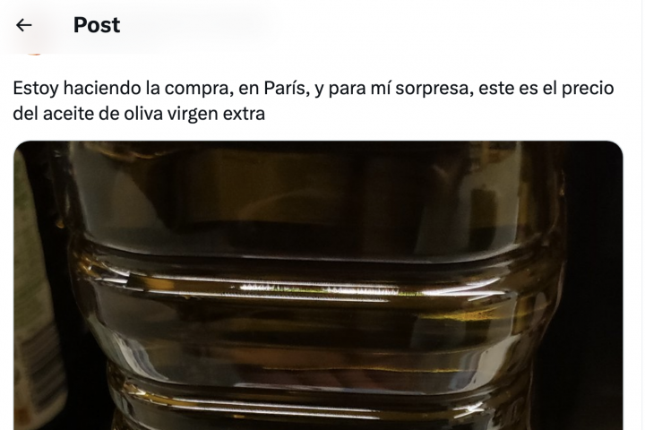 Ahora, un usuario de Twitter ha compartido lo que cuesta la botella de litro en un Alcampo de París: "Estoy haciendo la compra, en París, y para mí sorpresa, este es el precio del aceite de oliva virgen extra".