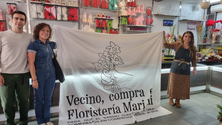 En la campaña han participado, de momento, cuatro de los ocho comercios de la zona con los que contactaron desde la escuela: la Floristería Mari Juli, la Mercería Barrio, la Librería Pueblos y Culturas y la G. Óptica Universal.