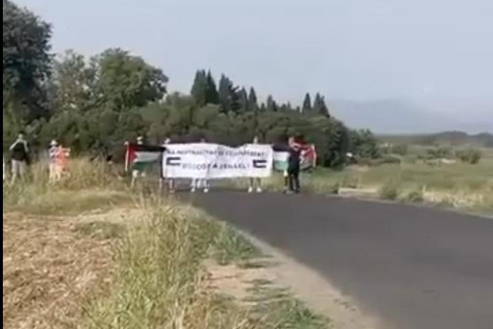 Esta primera protesta tuvo lugar el 27 de agosto y, como se puede ver en el vídeo adjuntado por @Copedaleando, cinco personas se plantan en medio de la carretera durante una prueba de contrarreloj y tratan de cortar la carrera con una bandera de Palestina y una pancarta.