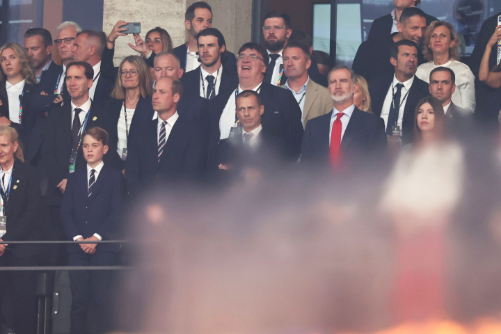 Por su parte, el rey está justo al lado del presidente de la UEFA, Aleksander Ceferin, y un paso más al lado está el príncipe Guillermo junto a su hijo. Al fondo está el exjugador del Real Madrid Gareth Bale, con quien se ha saludado Felipe VI, y el exfutbolista italiano Materazzi.