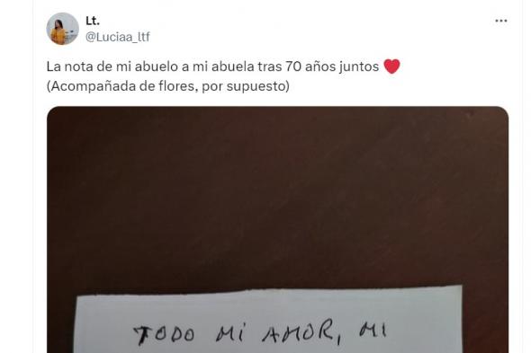 "La nota de mi abuelo a mi abuela tras 70 años juntos ❤️ (Acompañada de flores, por supuesto)", ha escrito la usuaria en su mensaje.