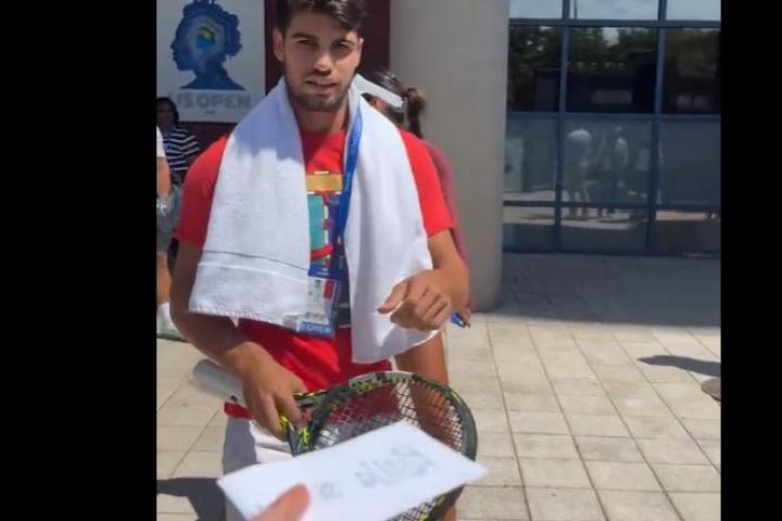"Baila si extrañabas el USO", se puede leer en el papel doblado que le da una mujer. Alcaraz, que no duda en leerlo, hace un pequeño baile y mira con una sonrisa a la autora del texto justo antes de comenzar la sesión de entrenamiento. Una nueva muestra más del gran momento en el que se encuentra el tenista murciano.