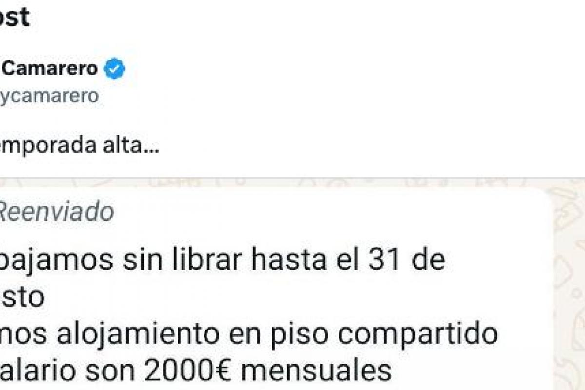 "Trabajamos sin librar hasta el 31 de agosto", empieza diciendo el mensaje en WhatsApp que le han dejado a la persona que pide información para la oferta. "Damos alojamiento en piso compartido", prosigue la oferta.
