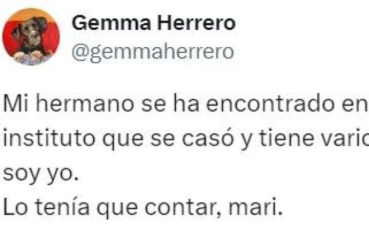 Pero la sorpresa no acaba aquí, porque lo realmente sorprendente de la historia es que el hermano descubrió que el chico que fue el primer amor de su hermana hace ya bastantes años está actualmente casado y con varios hijos con una mujer que se llama exactamente igual que la periodista: Gemma Herrero.