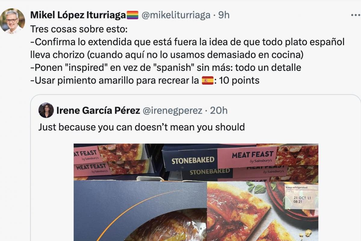 Esta pizza ha llegado a cientos de cuentas de toda España y ha sido Mikel Iturriaga, director de El Comidista, el que ha aportado más datos interesantes sobre que asocien lo típico español al chorizo cuando no es un producto que se use tanto en España para cocinar.