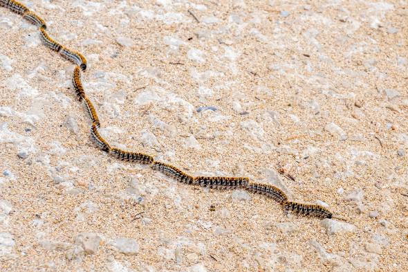 Durante estas semanas, en las que estas orugas dejan su estado larvario en el que se encontraban en los pinos, se las puede ver en largas hileras de ejemplares, uno detrás de otro, tal y como si fueran una procesión. Su camino y su recorrido es hasta encontrar bajo tierra un espacio en el que permanecer como crisálidas hasta que en verano vuelvan a ver la luz en forma de polillas.