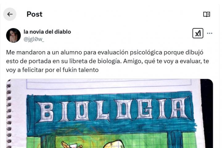 "Me mandaron a un alumno para evaluación psicológica porque dibujó esto de portada en su libreta de Biología. Amigo, qué te voy a evaluar, te voy a felicitar por el fukin talento", ha escrito junto a la imagen.