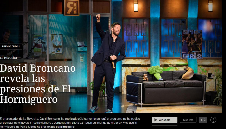 La descripción estira el chicle: "El presentador de La Revuelta, David Broncano, ha explicado públicamente por qué el programa no ha podido entrevistar este jueves 21 de noviembre a Jorge Martín, piloto campeón del mundo de MotoGP, y es que El Hormiguero de Pablo Motos ha presionado para impedirlo".