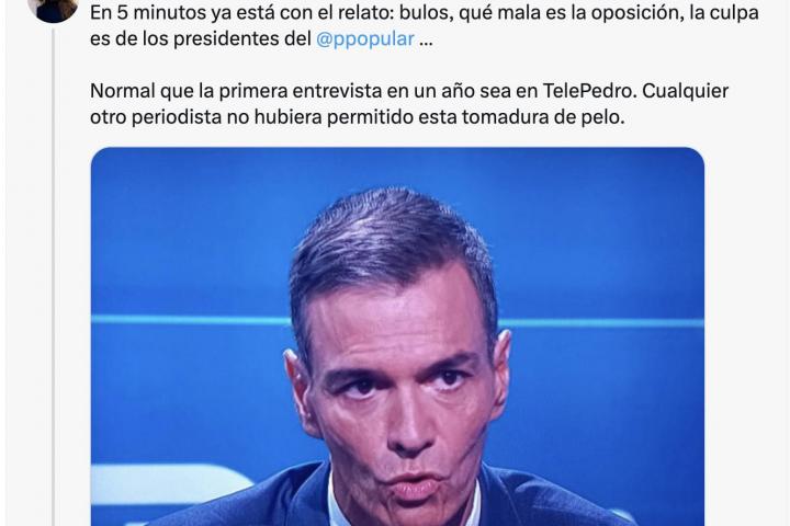 Y añadió al final del mensaje en la red social de Elon Musk: "Normal que la primera entrevista en un año sea en TelePedro. Cualquier otro periodista no hubiera permitido esta tomadura de pelo".