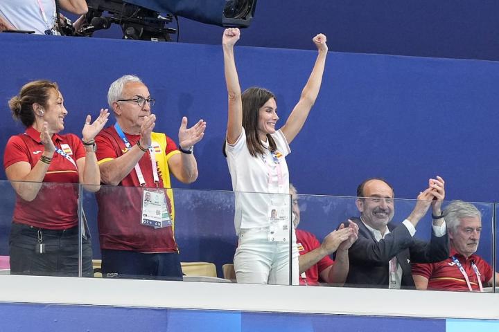 Comentan que "optó por un elegante conjunto blanco para la salida, vistiendo un par de jeans blancos con un sencillo cuello polo blanco, adornado con los colores de la bandera española en las mangas. Se pudo ver a Letizia, que asistió sola al evento sin su marido, el rey Felipe, saltando en el aire de alegría cuando el equipo de waterpolo se enfrentó al griego en el Centro Acuático el 31 de julio".
