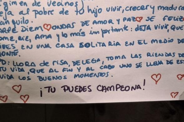 "Vive y deja vivir, tus gritos se escuchan todo el día (incluso en horarios vetados por el régimen de vecinos)", comienza su petición, escrita en una cuartilla adornada con corazones. Esta vecina, además, se atreve a darle un consejo sobre su hijo.