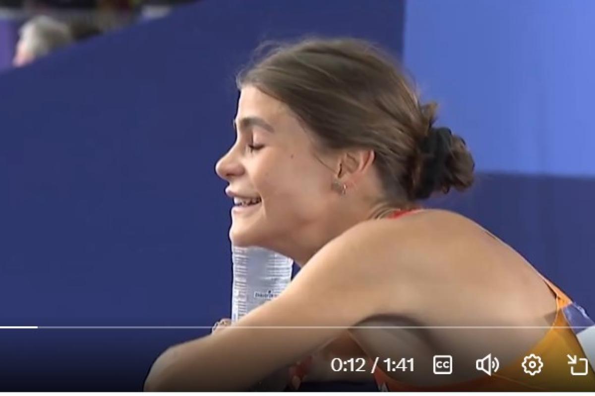 En las imágenes se ve la emocionadísima reacción que tiene Marqués al ver la carrera de su compañera y amiga Marta Pérez, que ha batido el récord de España.