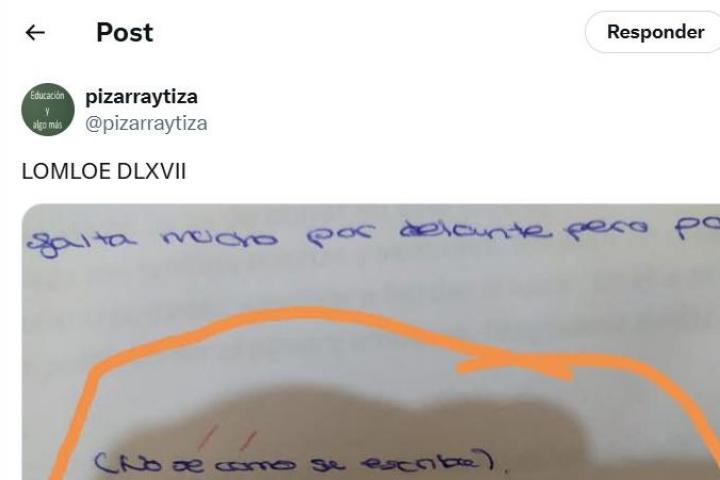 La imagen la ha subido la red social X el usuario @pizarraytiza junto al mensaje: "LOMLOE DLXVII". Y en el escrito del alumno en cuestión se puede ver que ha tratado de escribir el nombre de Ramón María del Valle-Inclán.