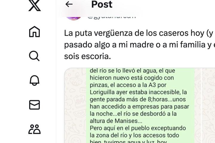 "Pero aquí en el pueblo exceptuando la zona del río y los accesos todo bien. La empresa de mi hijo se inundó, arrastrando camiones y coches. Han pasado la noche allí, sin luz", le ha seguido contando.