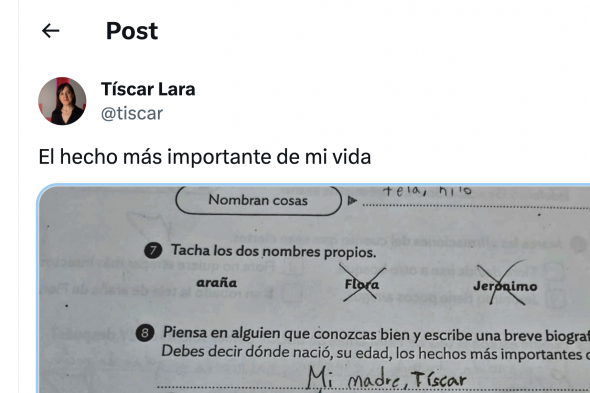 La Directora de Transformación y Comunicación Digital del Instituto Cervantes, Tíscar Lara, ha compartido en X, anteriormente Twitter, la bonita respuesta que ha dejado en un ejercicio de clase su hijo.
