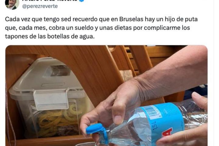 "Cada vez que tengo sed recuerdo que en Bruselas hay un hijo de puta que, cada mes, cobra un sueldo y unas dietas por complicarme los tapones de las botellas de agua", ha escrito sobre los tapones de plástico que ahora van pegados a la botella.