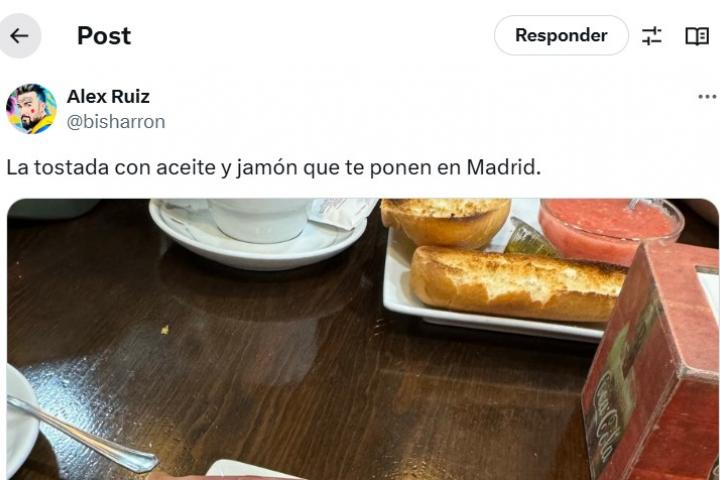 A ese mensaje ha respondido otra persona, @bisharron, que ha mostrado en una foto el nada apetecible plato que le sirvieron en un bar de Madrid al pedir una tostada con aceite y jamón. Y la imagen se está difundiendo rápidamente en la red social X.