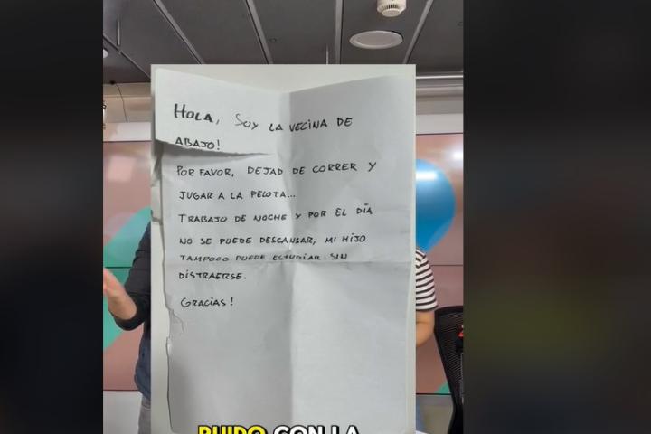 Como se puede ver en el cartel, la mujer decía: "Por favor, dejad de correr y de jugar a la pelota... Trabajo de noche y por el día no se puede descansar. Mi hijo tampoco puede estudiar sin distraerse. ¡Gracias!".