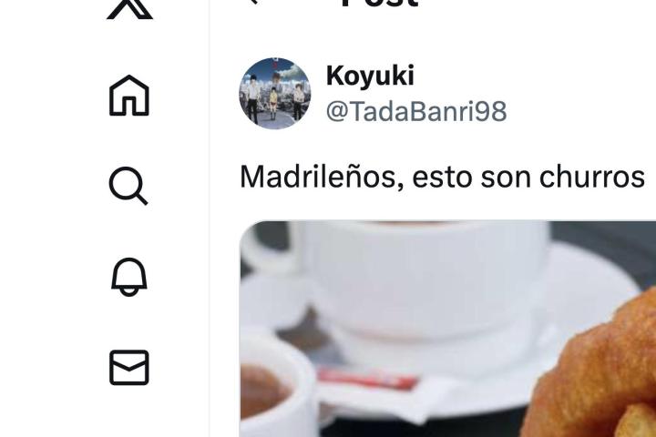 "Madrileños, esto son churros", reza el mensaje que ha compartido en X (antes Twitter) @TadaBanri98 con una foto en la que se puede ver un buen montón de "churros" junto a varias tazas de chocolate.