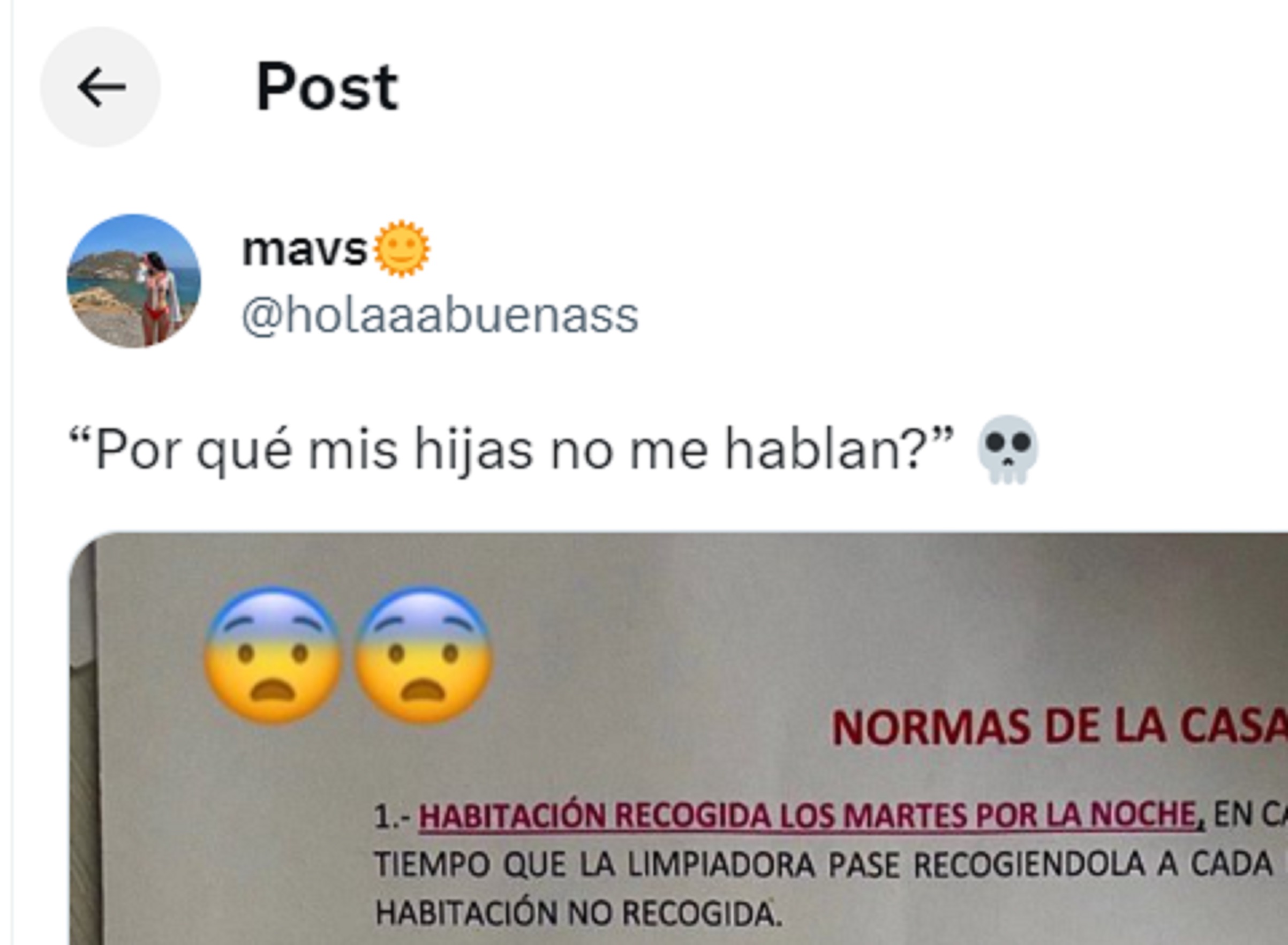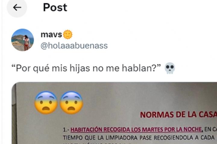 El letrero, que ha llegado a Twitter de la mano de la usuaria @holaaabuenass, lleva como encabezado "normas de la casa" y son una enorme lista de reglas que los hijos deben cumplir.