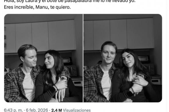 Eso sí, tiene el consuelo del dinero acumulado durante esos más de 400 programas de esfuerzo mental: 268.200 euros, Hacienda mediante. En X, Laura, la pareja de Manu, ha compartido una foto juntos y un emotivo mensaje: "Hola, soy Laura y el bote de Pasapalabra me lo he llevado yo. Eres increíble, Manu, te quiero".